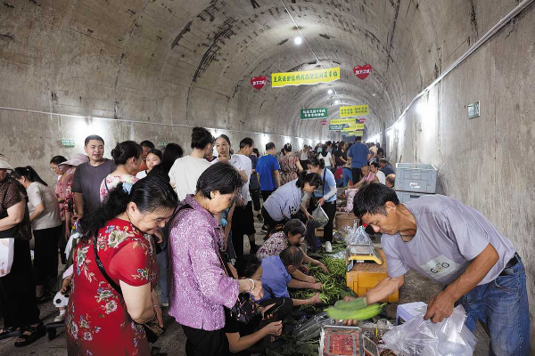 Urban residents travel to an air-raid shelter in Southwest China's Chongqing to buy fruits and vegetables on May 25, 2024. [LIU SONG/ZHAO DANDAN/FOR CHINA DAILY]