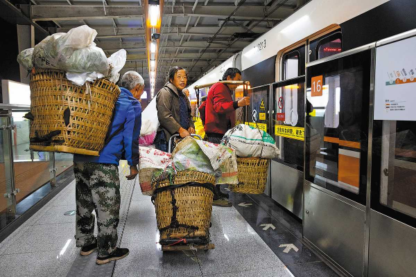 Farmers carrying their produce take the first train at 6:30 am from Shichuan Station on Line 4 to sell their produce on Nov 2, 2024. [LIU SONG/ZHAO DANDAN/FOR CHINA DAILY]