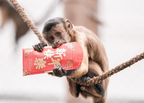 During the Chinese New Year's Eve celebration on Jan 28, zookeepers at the Locajoy Theme Park in Chongqing's Yongchuan district distributed food-filled red envelopes to its primates, including chimpanzees, squirrel monkeys, ring-tailed lemurs and black-capped capuchin monkeys.