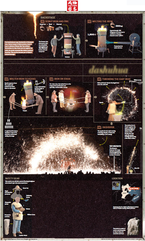 Dashuhua, literally "striking iron flowers", is a traditional folk performance in Yuxian county, Zhangjiakou, Hebei province, that dazzles the spectators with a brilliant shower of sparks resembling a tree canopy. Yuxian, once an important military garrison during the Ming Dynasty (1368-1644), is dotted with fortresses for defense, endowing the folk art with creative features.
