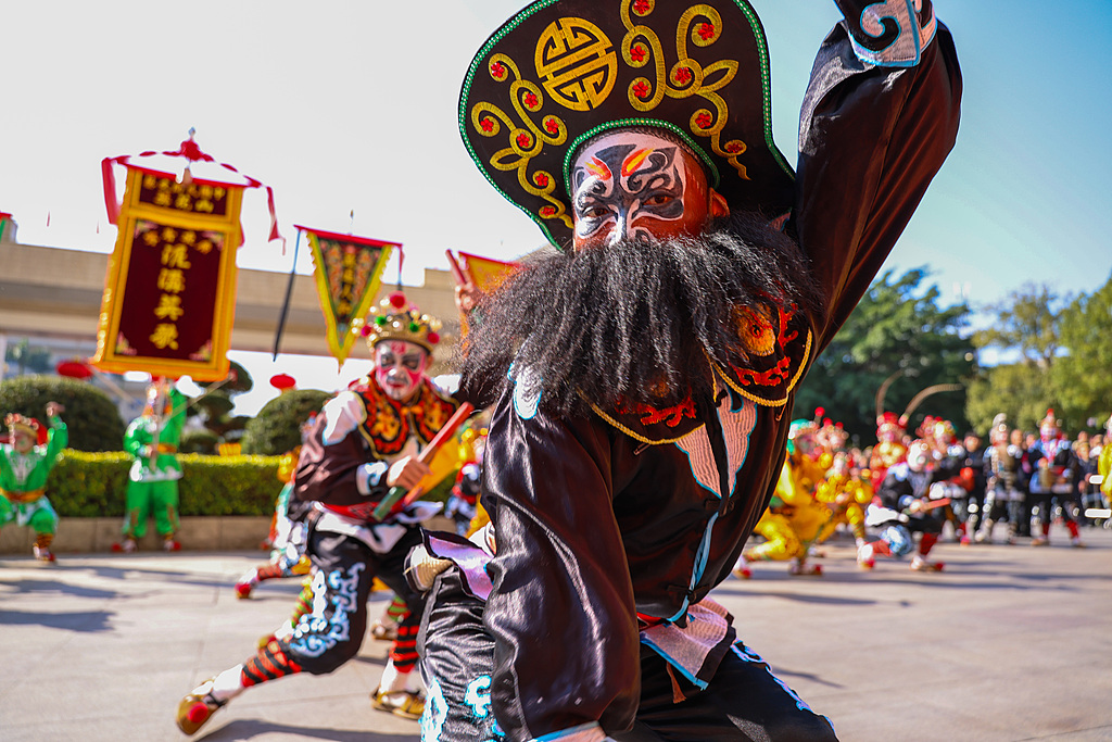 A vibrant display of intangible cultural heritage takes center stage in Jieyang, Guangdong province. Performers dressed in colorful costumes captivate tourists and residents with traditional Yingge and lion dances on Jan 30, 2025. [Photo/VCG]