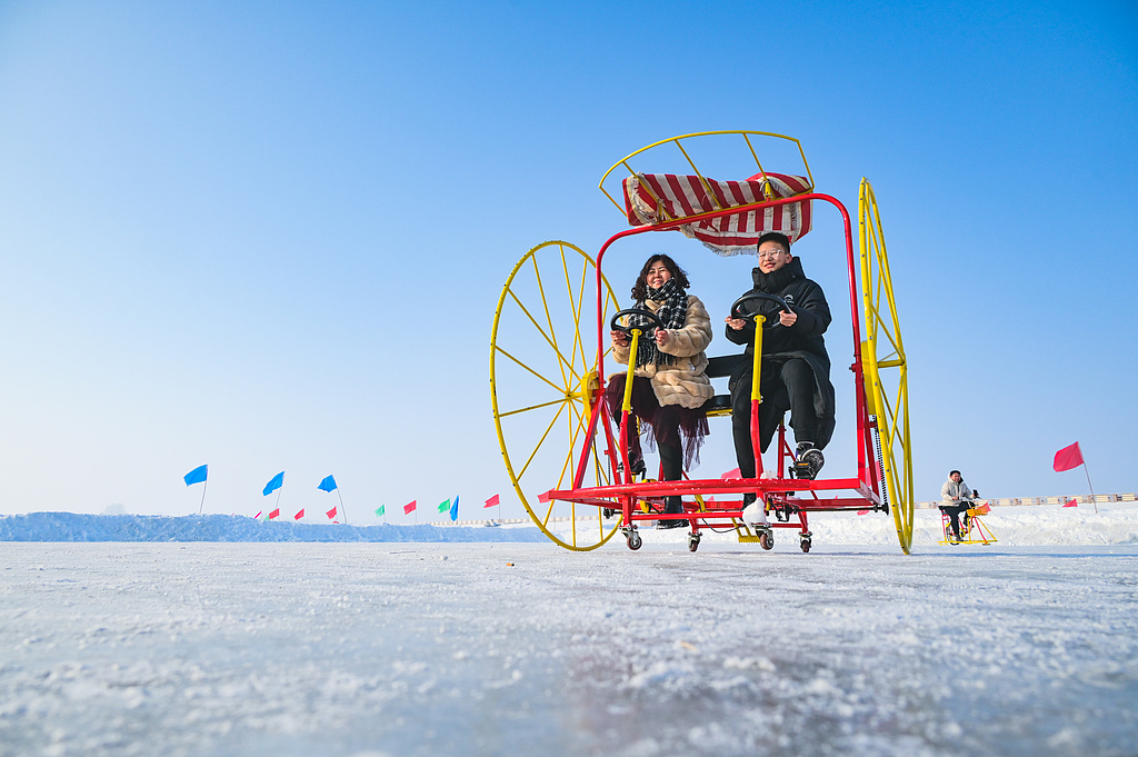 Visitors enjoy snow biking at Baiquan Lake in Hutubi county, Changji Hui autonomous prefecture, Xinjiang Uygur autonomous region on Jan 28, 2025. [Photo/VCG]
