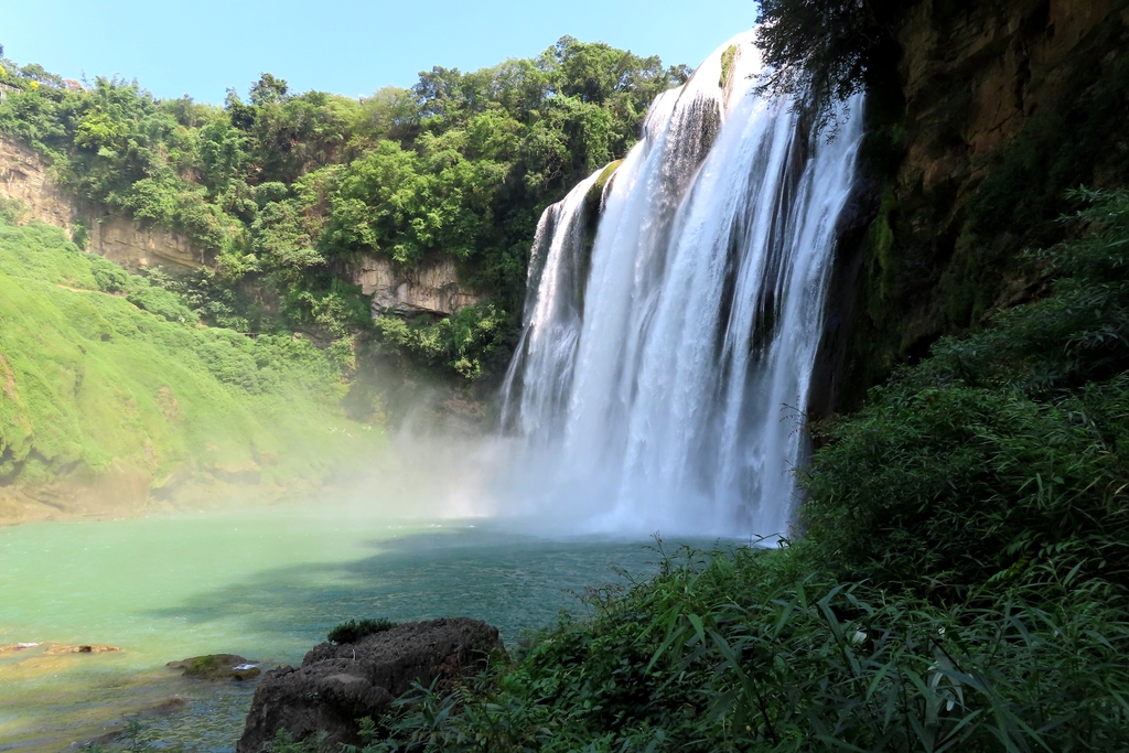 The spectacular waterfall is 77.8 meters high and 101 meters wide. Situated over the Baishui River in the Bouyei and Miao autonomous county, it is part of a karst landform and was named after the Huangguo tree, a special plant species found in the region. Behind it is a 134-meter-long water-curtain cave, which allows tourists to go inside, touch the waterfall and even see a rainbow arching across the fall on a sunny day.