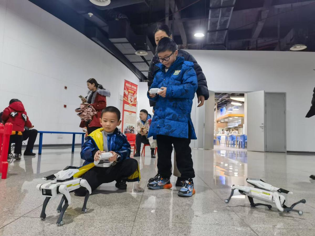 Visitors use remote controllers to operate a robot dog in Changsha, Hunan province. [Photo provided to chinadaily.com.cn]
