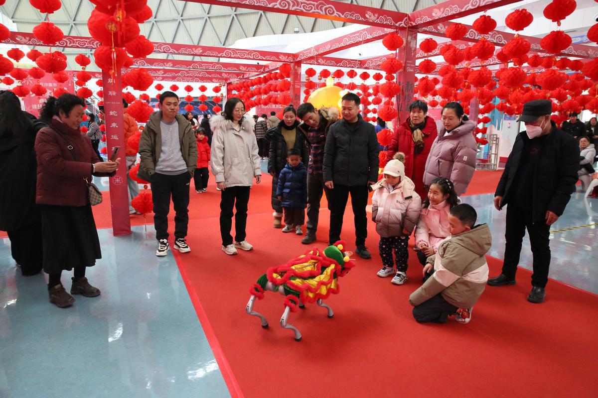 Visitors watch a lion dance performance by a robot dog in Xining, Qinghai province. [Photo provided to chinadaily.com.cn]