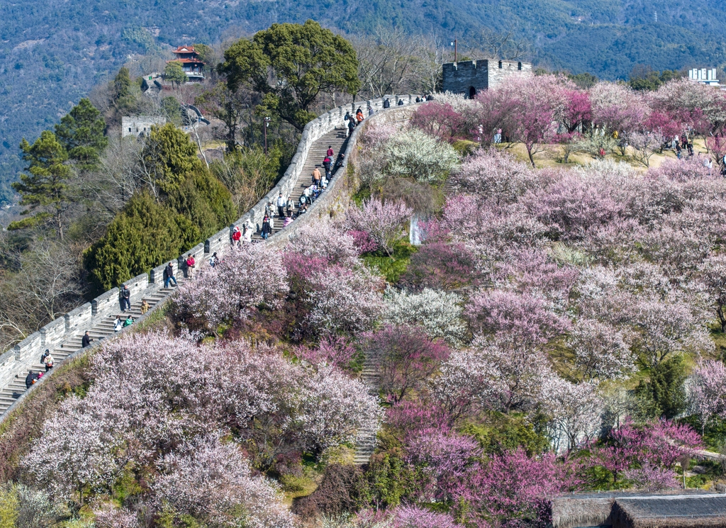 Over 200 plum trees are blooming along the ancient Linhai Great Wall in Taizhou, Zhejiang province! The colorful blossoms create a breathtaking contrast against the historic wall, drawing visitors to capture the beauty of spring.