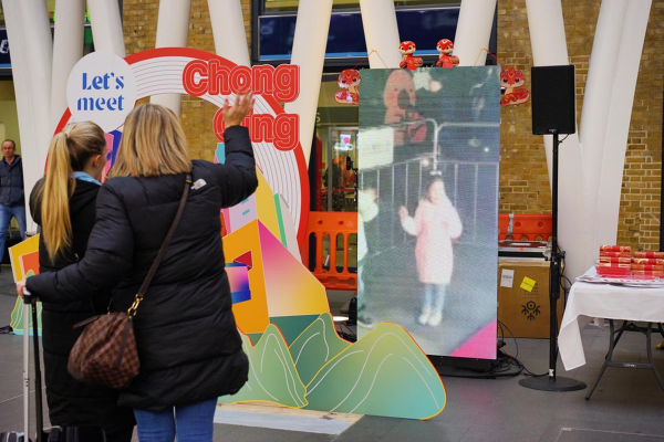 A screen featuring the iconic stilt-building complex Hongyadong in Chongqing Municipality in Southwest China and London's Tower Bridge lit up on Thursday at King's Cross station, one of London's busiest railway hubs.