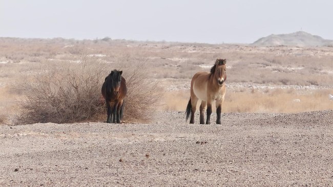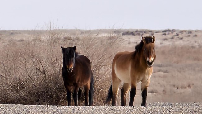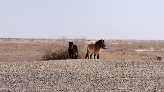 Rare Przewalski's horses were recently sighted at the Yumen Pass scenic area in Dunhuang, Gansu province.