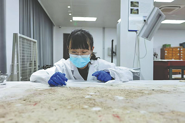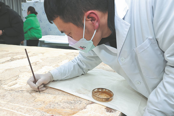 A specialist in the process of delicately restoring murals in a lab at the Shaanxi History Museum in Xi'an, Shaanxi province. [Photo provided to China Daily]