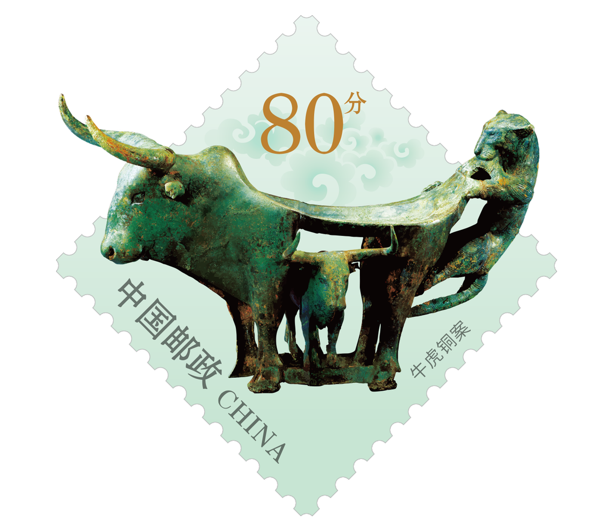 The unique stamp inspired by the bronze table with figurine of tiger and oxen has been released by Yunnan Provincial Museum. [Photo/Official WeChat account of Yunnan Provincial Museum]