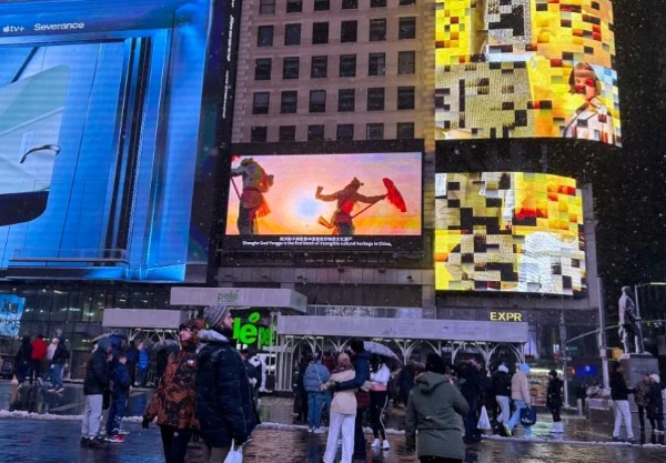 The Shanghe drum yangko dance has come to New York's Times Square. A video promoting the traditional dance was played on loop on the square's outdoor screens throughout the day, captured the attention of many US viewers.