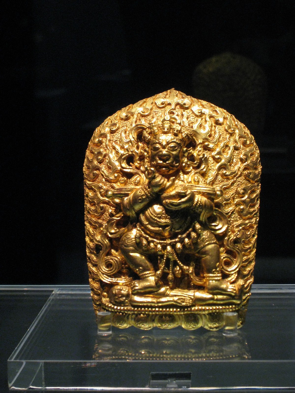 Take a closer look at this golden accessory of the Buddhist deity Mahākāla from the Ming Dynasty (1368-1644). With three wide-open eyes, sharp fangs and a crown of five skulls, this striking figure radiates power and mystery. Snakes coil around his ears, arms and waist, while a halo of flames rises from behind. The small holes around the halo's edge hint that this piece may have functioned as a protective amulet, perhaps attached to a hat.