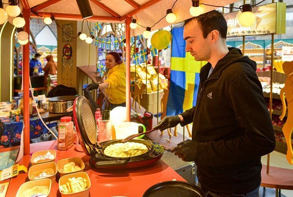 At the Spanish booth, Juan, a young chef, made traditional Spanish pancakes, filling them with creamy dairy and cocoa paste. "Delicious!" a visitor praised. Juan, in fluent Chinese, invited more people to try his creation.