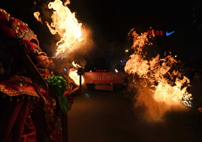 A folk artist performs a fire-spitting stunt in Cangxi county, Guangyuan, Southwest China's Sichuan province. [Photo provided to cngy.gov.cn]