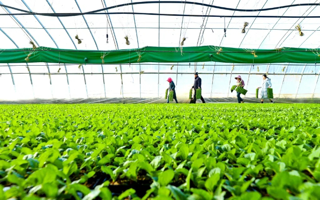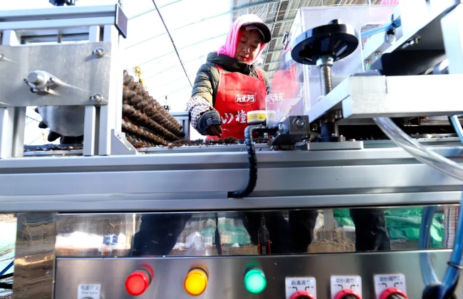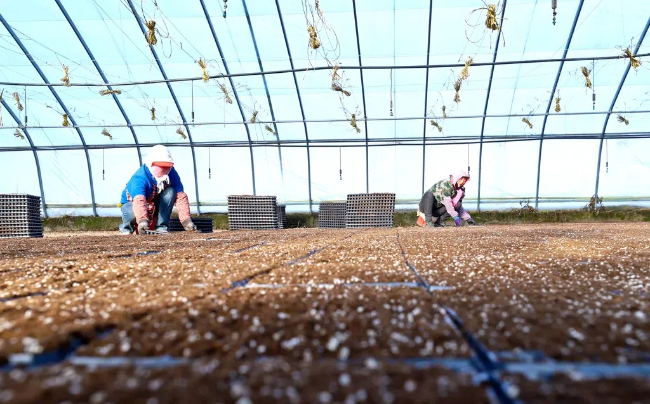 In Leizhai village, Dangzhai town, Zhangye, farmers at the organic vegetable seedling center were busy transferring baby Chinese cabbage seedlings from nursery greenhouses to cultivation facilities on Feb 14.