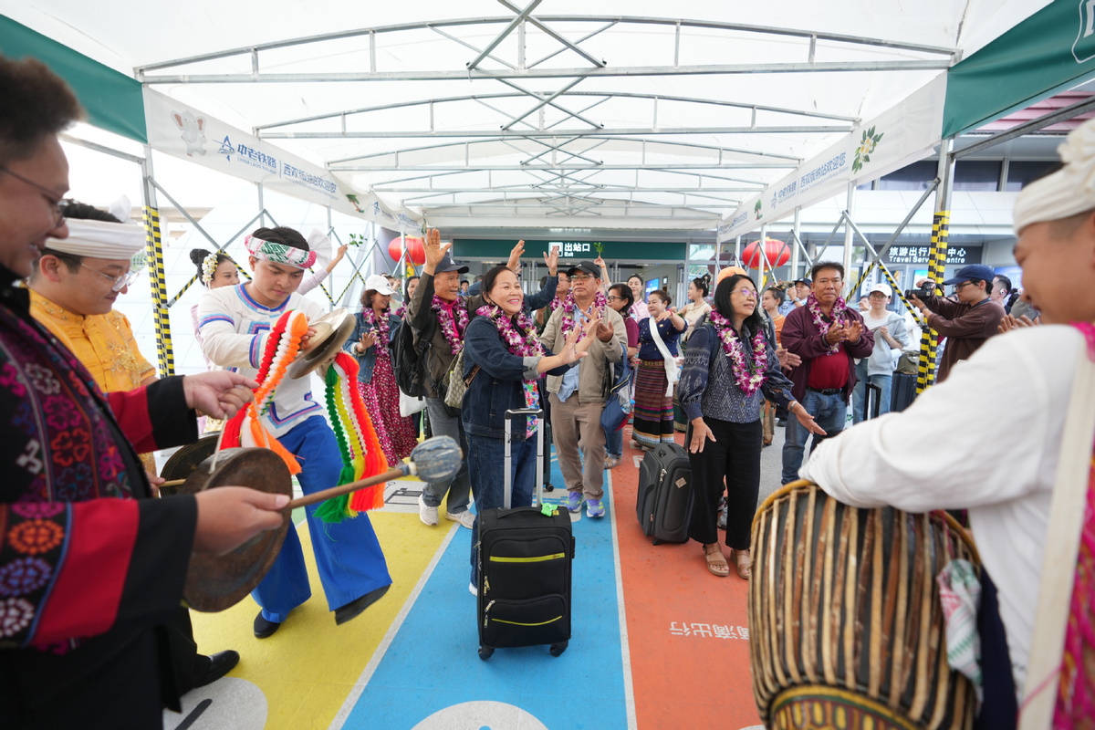 Tourists from Laos and Thailand are greeted upon arrival at the Xishuangbanna railway station in Jinghong city, Xishuangbanna Dai autonomous prefecture, Southwest China's Yunnan province, Feb 18, 2025. [Photo/Xinhua]
