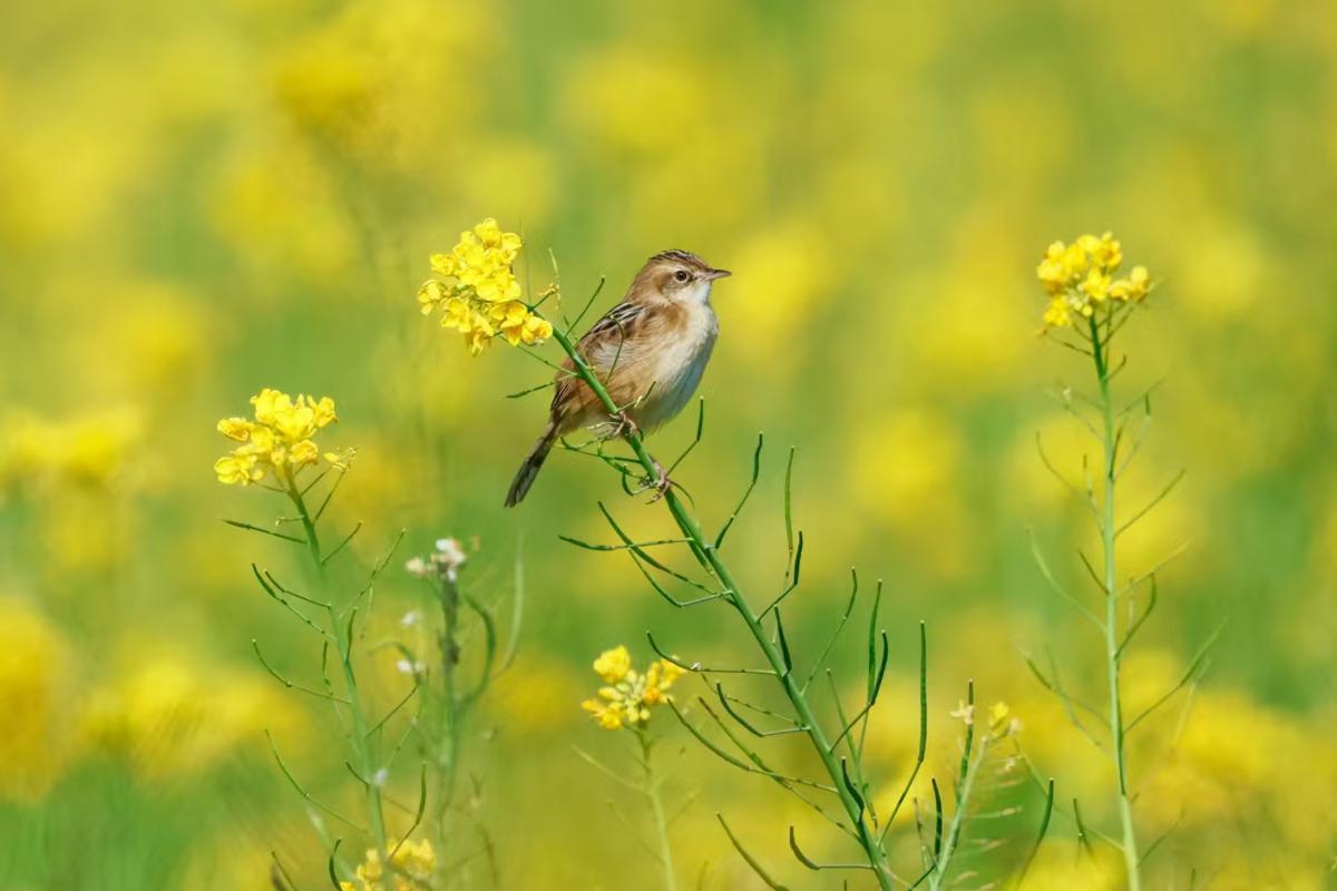 A bird perches on a rapeseed flower in Dongfu, Xiamen, Fujian province. [Photo by Xiao Xiaojing/for chinadaily.com.cn]
