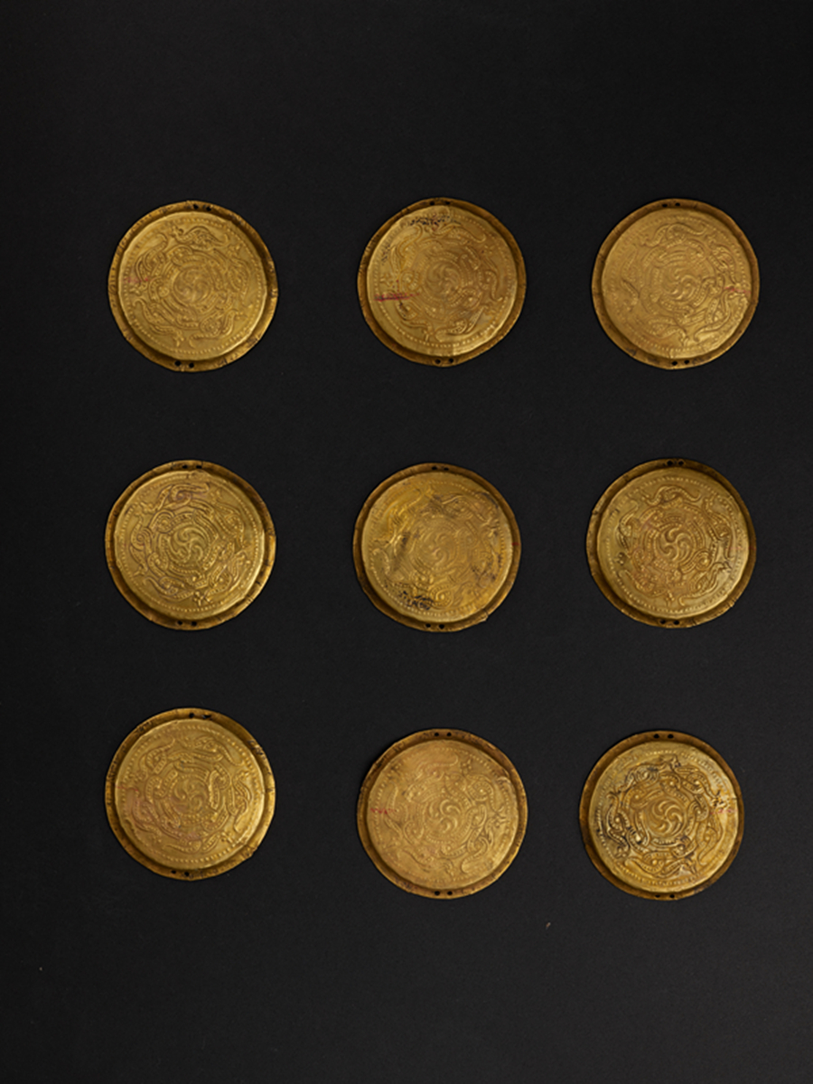 These nine identical gold pieces crafted during the Warring States Period (475-221 BC) are exquisite ornaments. Each piece features a raised center, adorned with coiled snake motifs, swirling patterns and interlocking bead decorations on the front, while the back remains smooth and unadorned. With small perforations along the edges, these ornaments were likely to be sewn onto garments or ceremonial items.