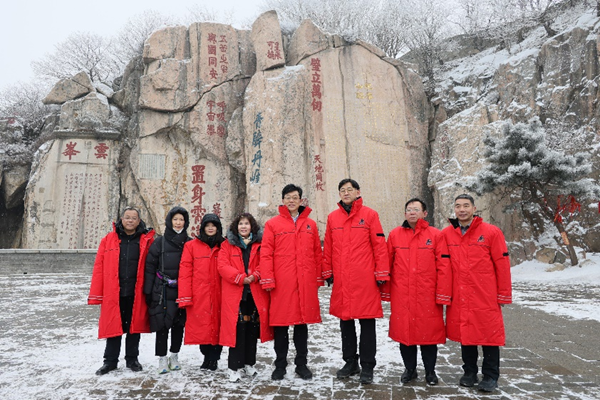 Participants of the joint mountain climbing event take a group photo on Taishan Mountain in Tai'an, Shandong province on Feb 22. [Photo provided to chinadaily.com.cn]