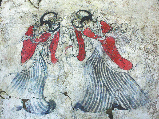 Murals Gao Chunlin replicates from Tang tombs depict two women dancing. [Photo provided to China Daily]