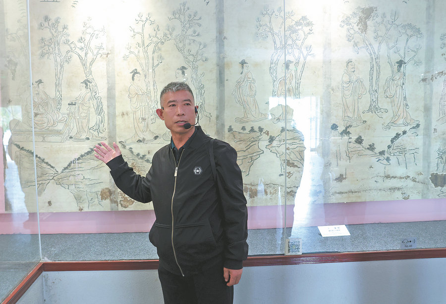 Gao introduces the murals he replicated from a satellite tomb of Zhaoling Mausoleum at the Zhaoling Museum in Liquan county, Shaanxi province, in October. [Photo by Zou Hong/China Daily]