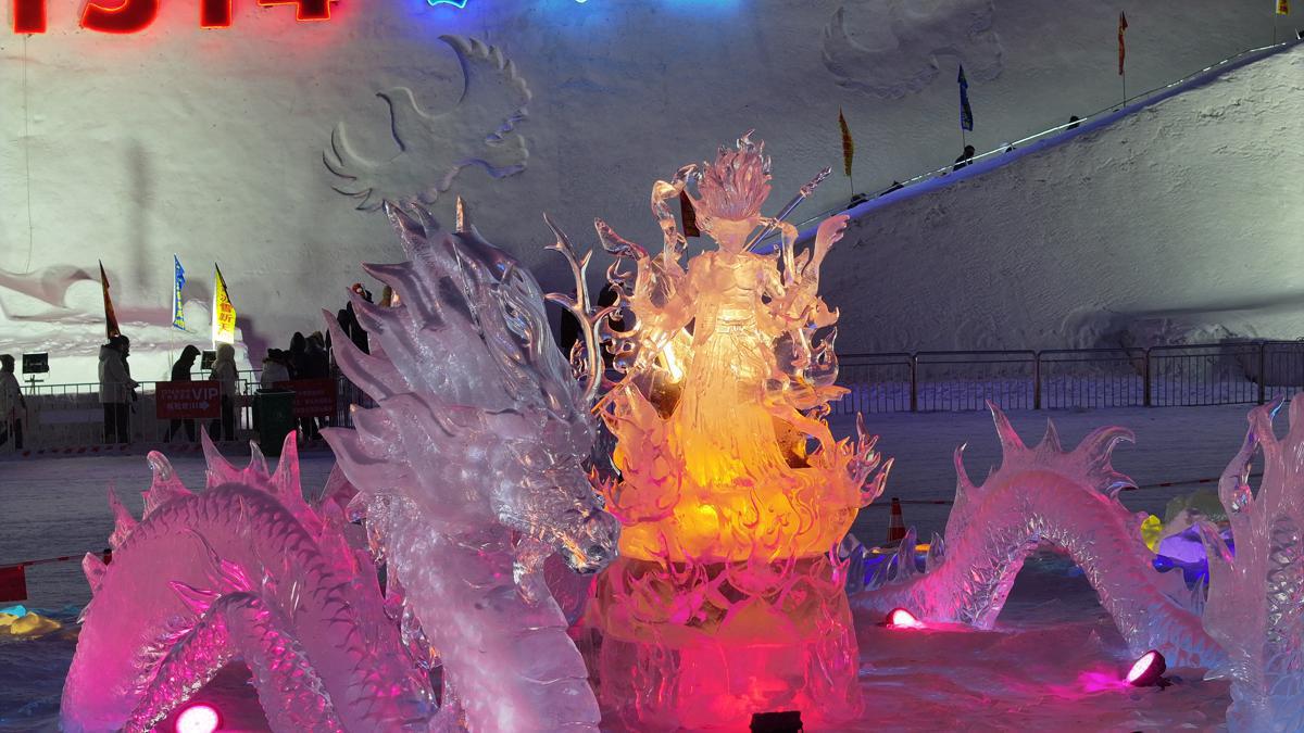 An ice sculpture featuring the character Ne Zha stands amidst ice and snow at the Changchun Ice and Snow New World in Changchun, Jilin province. [Photo by Jin Shengze/For chinadaily.com.cn]