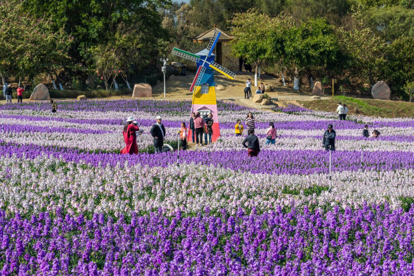 In February, residents and tourists play in the violet flower sea at Xiangshan Mountain in Xiamen, Fujian province. [Photo provided to chinadaily.com.cn]