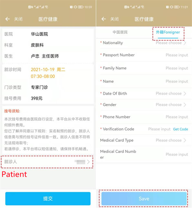 If it's your first visit, touch "Patient" → "Add Patient" → "Foreigner" → Then enter your personal information as required → Finally, touch "Save".