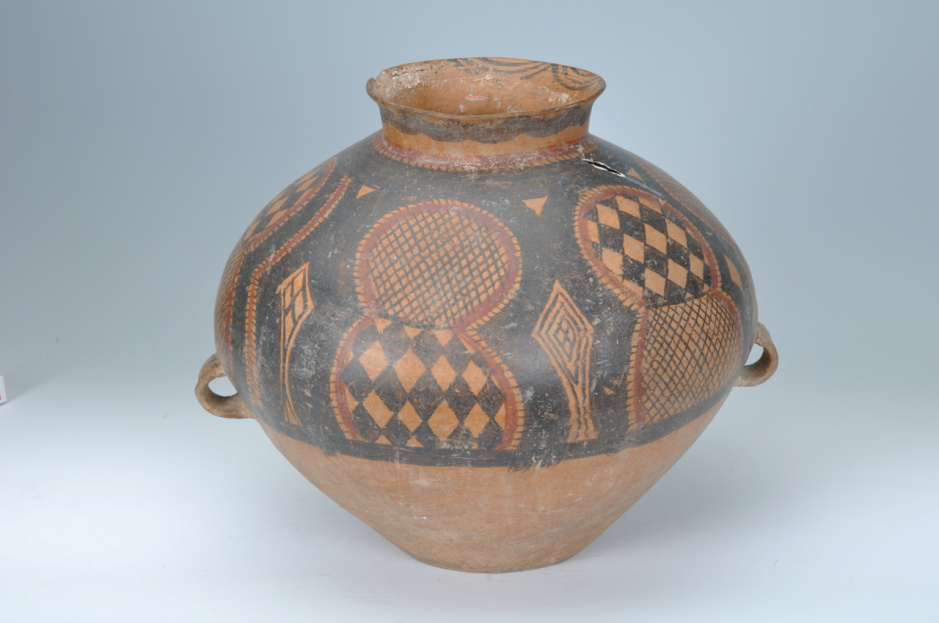 This painted pottery pot is typically from the Majiayao Culture (Banshan type). Dating back more than 4,000 years, it has a wide mouth, a short neck, a round belly and two handles.