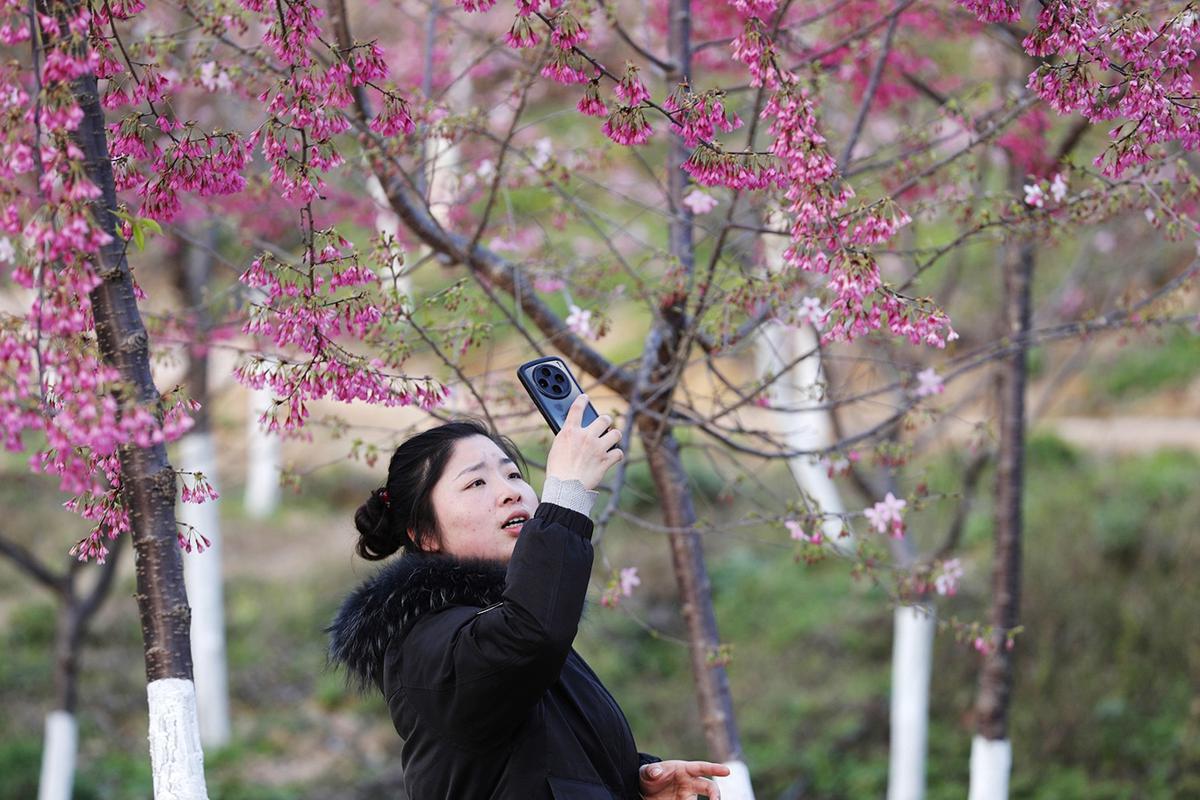 The cherry blossoms in Qianli Yingyuan, on the western outskirts of Zhongxian county in Chongqing, recently burst into vibrant colors, thanks to the rise of spring temperatures. [Photo by Yu Hong/For chinadaily.com.cn]