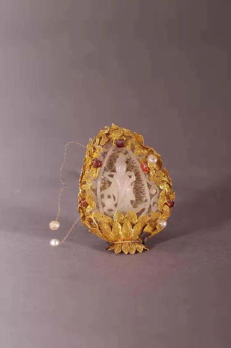 Gold filigree hairpin inlaid with carved white jade depicting the Avalokitesvara holding a creel, discovered inside the stupa [Photo/Official WeChat account of Lanzhou Museum]