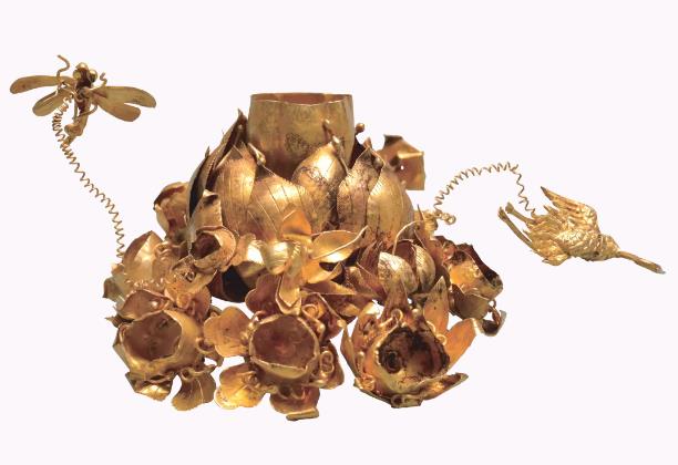 Gold hair decoration embedded with gems and in the design of an egret, a dragonfly and lotus flowers [Photo/Official WeChat account of Jiangxi Provincial Museum]