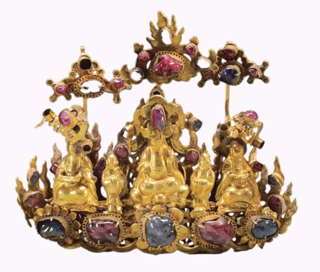 Gold hair decoration embedded with gems and in the design of three Bodhisattvas [Photo/Official WeChat account of Jiangxi Provincial Museum]