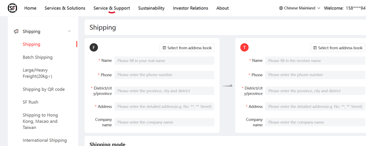 Step 1: Visit the official website of SF Express, and select "Ship Now" on the homepage, or select "Shipping" from the "Service & Support" menu.
