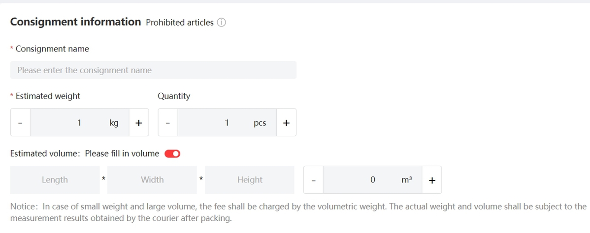 Step 4: Enter a one-word description of the contents and select from the available options, or click "Confirm" to enter. Next, enter estimated weight and quantity.