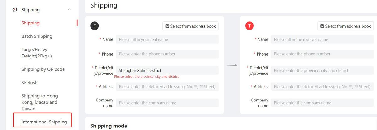 Step 2: Fill out the form by providing the name, local phone number, and local address in China for both the sender and recipient.