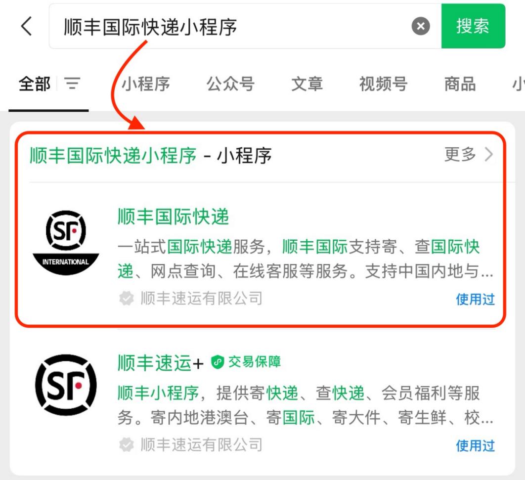 You can also search for international shipping services in WeChat Mini Programs. From the "Discover" menu, click on Mini Programs and search for "SF International" or "顺丰国际快递" in the search box.