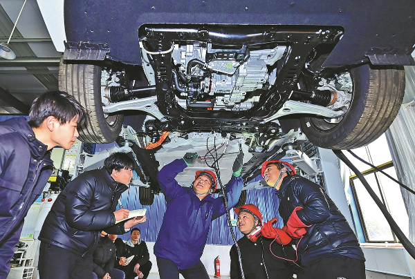 Students learn battery pack repair during a new energy vehicle operations and maintenance course at a vocational school in Yichun, Jiangxi province, on Feb 17. [ZHU HAIPENG/FOR CHINA DAILY]