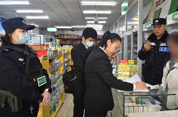 Liu Ying (3rd L), a judge with the People's Court of Haidian district of Beijing, talks with a litigant via a phone at a pharmacy in Beijing, March 4, 2025. A person's face (1st R) is blurred for privacy protection. [Photo/Xinhua]