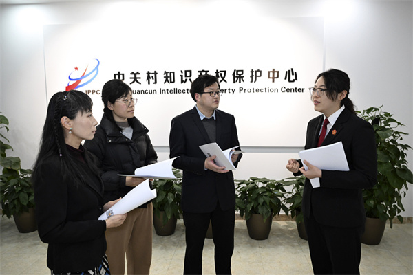 Li Sidi (1st R), a judge with the People's Court of Haidian district of Beijing, talks with staff members of Zhongguancun Intellectual Property Protection Center in Beijing, March 7, 2025. [Photo/Xinhua]