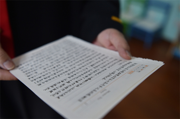 Zhang Ying, a judge with the People's Court of Haidian district of Beijing, holds a letter of gratitude from a litigant at a juvenile court of the People's Court of Haidian district in Beijing, March 4, 2025. [Photo/Xinhua]