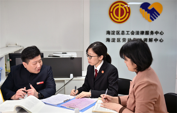 Wang Yan (C), a judge with the People's Court of Haidian district of Beijing, talks with staff members of a labor dispute mediation center in Beijing, March 6, 2025. [Photo/Xinhua]