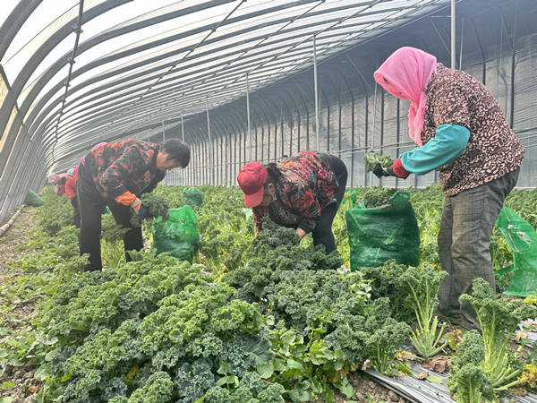 Farmers harvest kale in a greenhouse in Gaomi in March. ZHAO RUIXUE/CHINA DAILY
