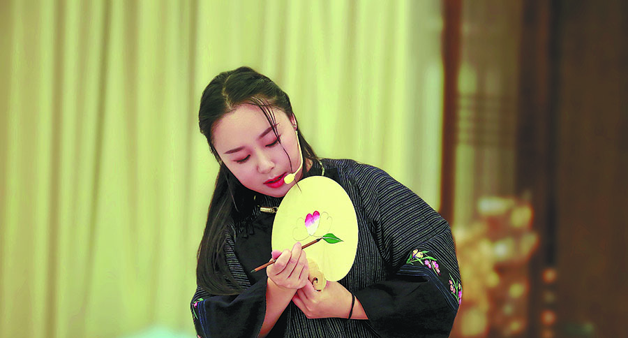 Liang Jincui displays a fan painting at an art exhibition in the Xiangxi Tujia and Miao autonomous prefecture. [Photo provided to China Daily]