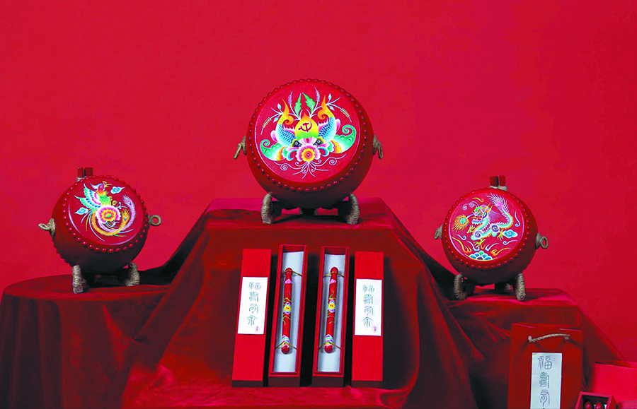 A set of mini-drums embellished with Miao designs by Liang Jincui. [Photo provided to China Daily]
