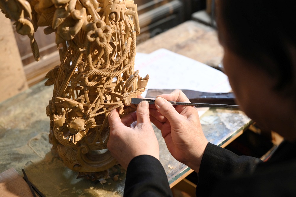 Gu Liuxi crafts his wood caring work. [Photo/IC]