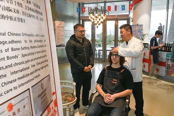 Guo Junsheng, a fourth-generation inheritor of Guo's traditional Chinese medicine bone setting, demonstrated his skills, attracting Chinese and international guests and students from Italy, France, and Zambia who were fascinated by the experience, with one commenting on how much relief they felt after the treatment.