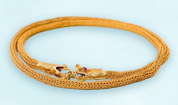 Gold necklace decorated with gem-embedded dragon heads, Song Dynasty (960-1279), collected in 2023 [Photo/Official WeChat account of the China Grand Canal Museum]
