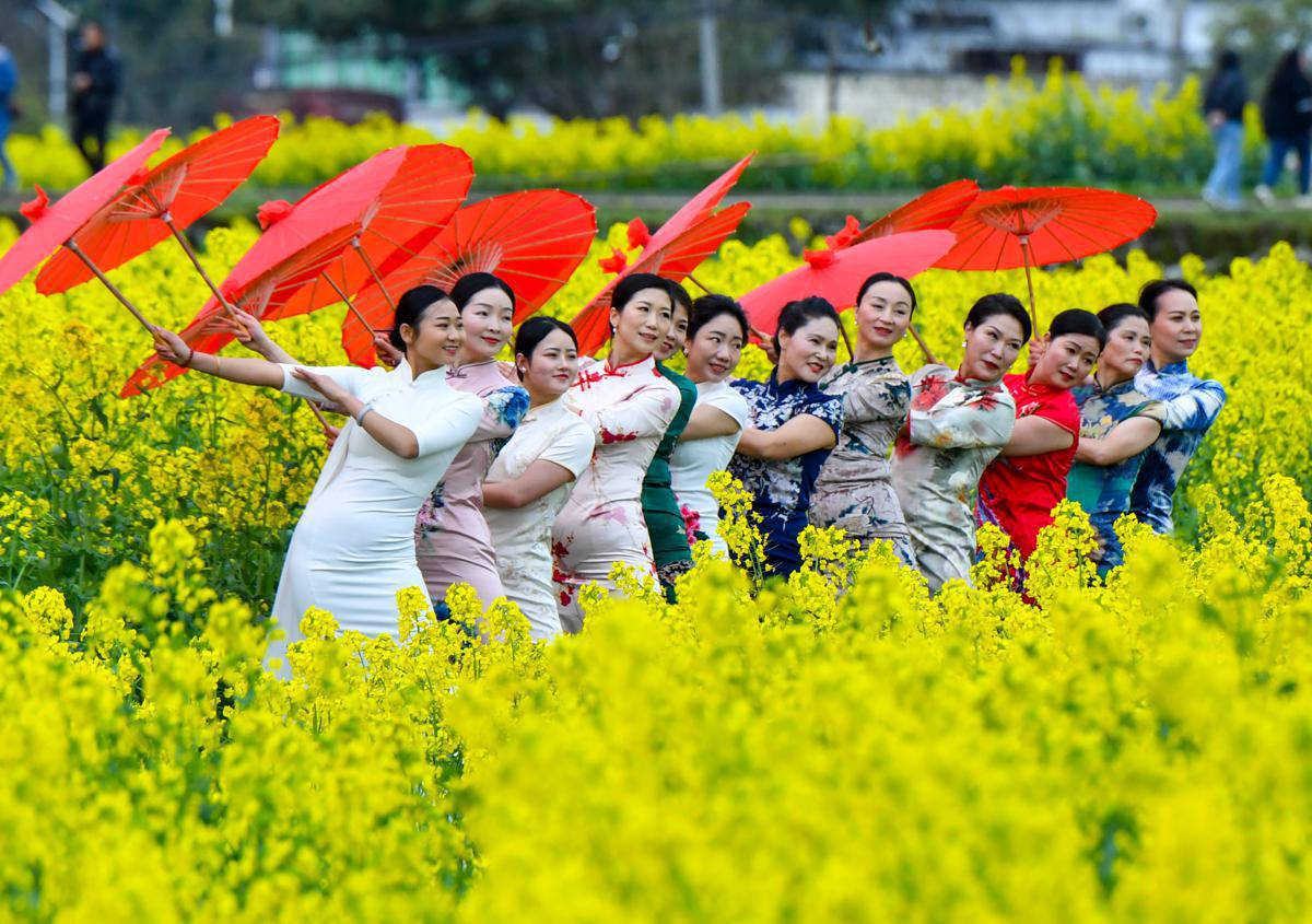 The ongoing rapeseed blossom festival in the county's Muba township has introduced a series of innovative activities alongside flower viewing, including qipao and hanfu (traditional Chinese attire) fashion shows, folk wedding parades, duck-catching competitions in rice fields, and tea brewing around stoves, offering visitors an unprecedented immersive experience.