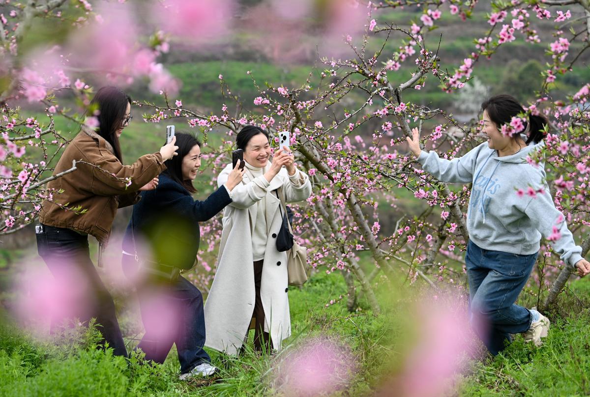 Visitors take photos amidst peach blossoms in Xinyuan township, Peng'an county, Sichuan province, on Monday. [Photo by Liu Yonghong/For chinadaily.com.cn]